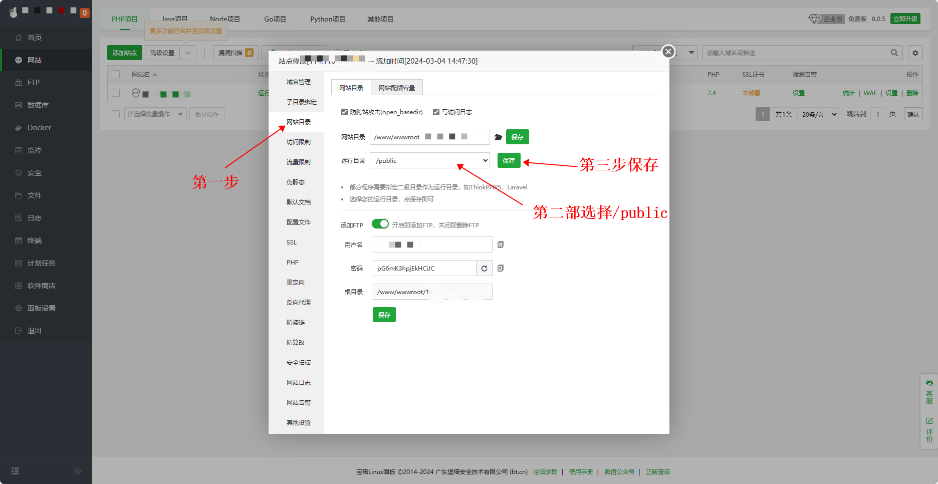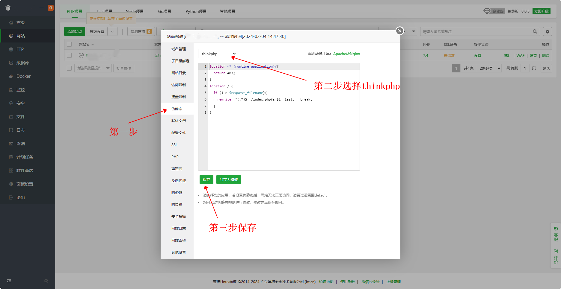 4、设置站点根目录为public, 伪静态规则为thinkphp