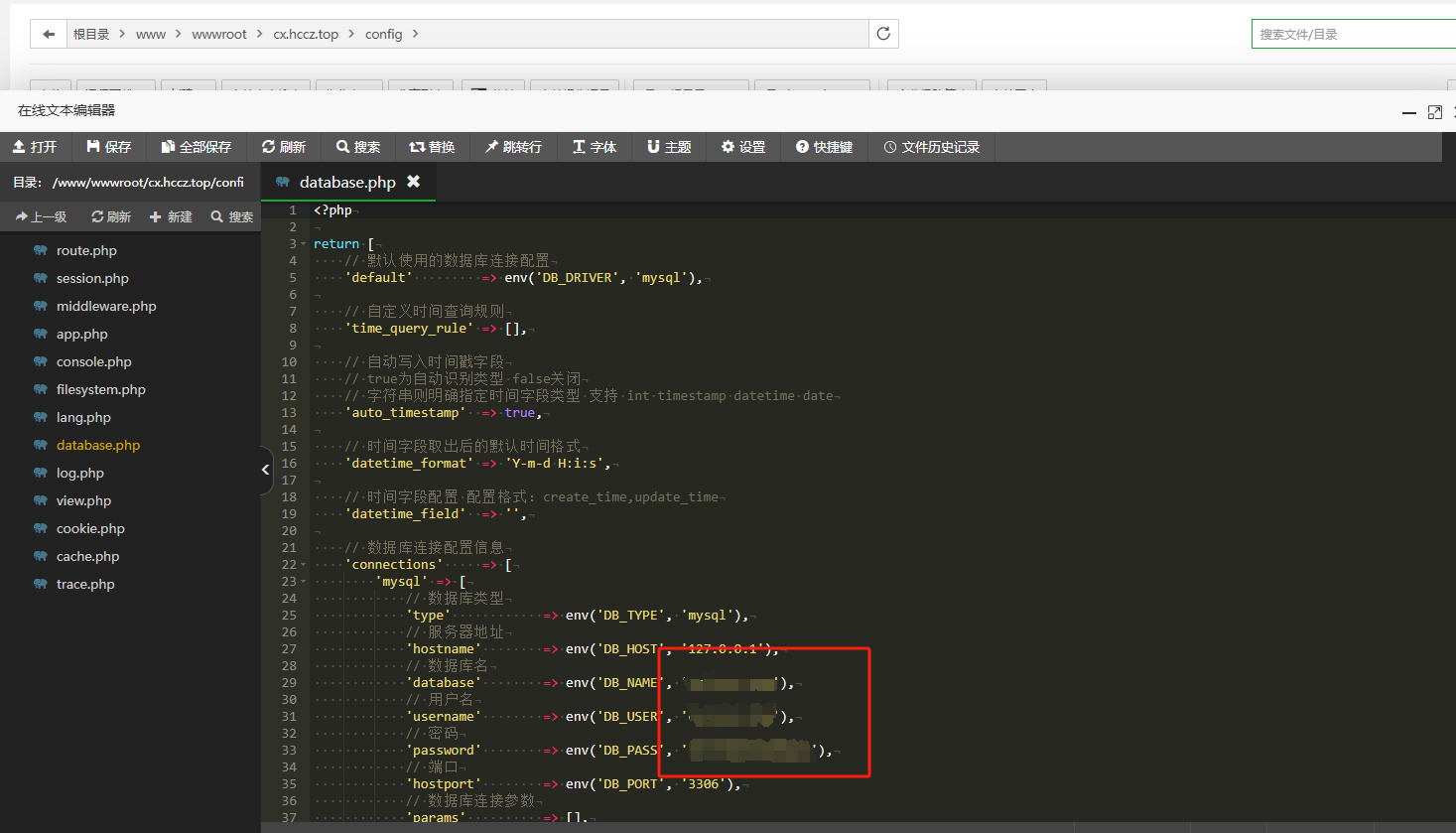 3、打开/config/database.php目录文件,然后进行配置数据库信息